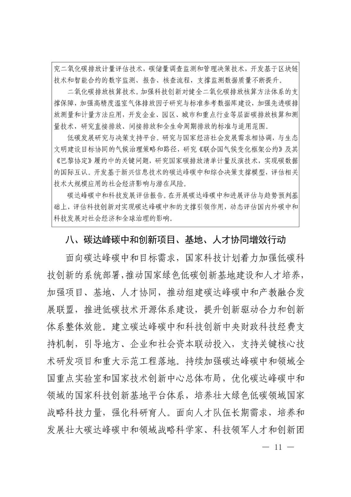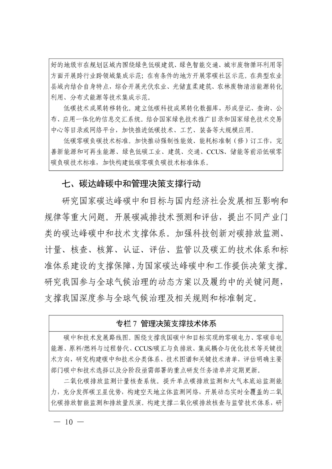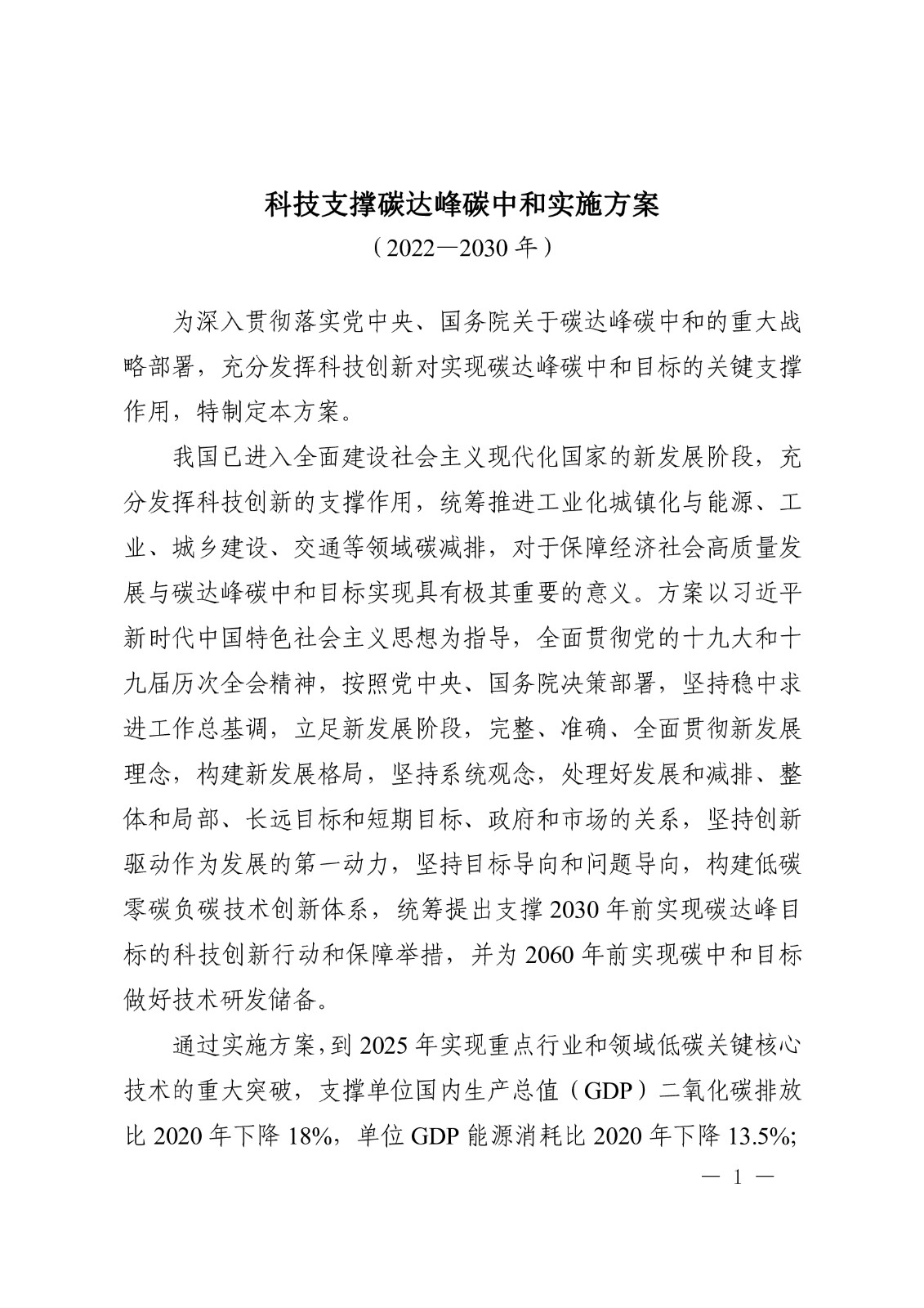 為深入貫徹落實黨中央、國務院關于碳達峰碳中和的重大戰(zhàn)略決策,做好科技支撐碳達峰碳中和相關工作,依據(jù)《中共中央 國務院關于完整準確全面貫徹新發(fā)展理念做好碳達峰碳中和工作的意見》《2030年前碳達峰行動方案》,結合碳達峰碳中和領域科技創(chuàng)新工作新形勢新情況,科技部、國家發(fā)展改革委、工業(yè)和信息化部、生態(tài)環(huán)境部、住房城鄉(xiāng)建設部、交通運輸部、中科院、工程院、國家能源局共同研究制定了《科技支撐碳達峰碳中和實施方案(2022—2030年)》?,F(xiàn)印發(fā)給你們,請遵照執(zhí)行。